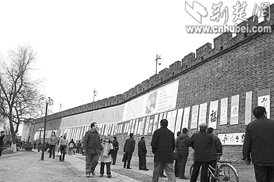 荊楚網(楚天都市報)(記者釋喻 攝)前日上午,襄樊西門橋古城墻上舉辦了一場別開生面的書法展,近百幅作品被懸掛在城墻上,向市民免費展出,展覽為期7天。此次活動由襄樊市文聯(lián)等單位舉辦,展出的是書法家王樹人先生的遺作和其傳人的近期作品;顒蝇F(xiàn)場還進行了書法義賣,所得款項將用于襄樊歷史文化名城的保護和宣傳工作。