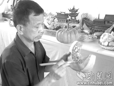 民間藝人黃茂才,在武鋼一材料廠干舞臺(tái)美工,練得一手好手藝。2002年單位排練舞蹈“辣妹子”,他用泡沫給12位演員分別做了一串火辣辣的辣椒,幾可亂真。