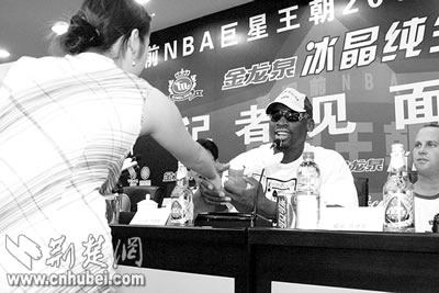 “是張學(xué)友來武漢唱狼湖嗎?”“不,是羅德曼,就是那個(gè)打籃球的”。在接機(jī)的人群里,兩個(gè)年輕人議論著。在他們的面前,26個(gè)身著緊身運(yùn)動(dòng)裝的青春少女手持鮮花,這是組織者安排的“籃球?qū)氊悺;另一邊,攝像機(jī)、照相機(jī)、采訪話筒一字排開,記者們翹首以待。