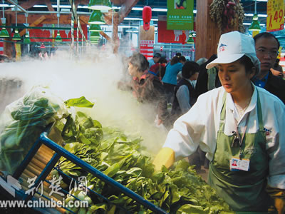 商業(yè)和物流的發(fā)展,讓購物環(huán)境變優(yōu)美了,品種更豐富了,市民可在明亮潔凈的超市中選購物品(下圖),甚至打個電話,點擊鼠標(biāo),足不出戶,需要的物品都能及時送到手中。武漢市正在發(fā)揮區(qū)位交通流通優(yōu)勢,成為萬商云集的“聚寶盆”。