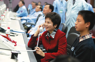 12日21時34分,正在神舟六號飛船返回艙內(nèi)的航天員費俊龍和聶海勝與北京航天飛控中心指控大廳內(nèi)的家人進行天地通話。