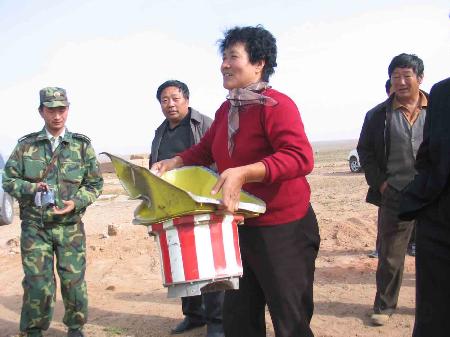 記者在搜索現(xiàn)場看到,從四面八方趕來的牧民群眾個個都有所獲。“哈呀,人們常說天上掉餡餅,這不應(yīng)驗了?”牧民張金虎指著自己撿到的一堆殘骸,興奮地開著玩笑。牧民烏云還向記者炫耀,她和丈夫烏力吉今天特意起了個大早,在家焚香默默祝愿神舟六號飛船試驗成功,所以今天他們撿到的殘骸最多,能裝滿滿一車。