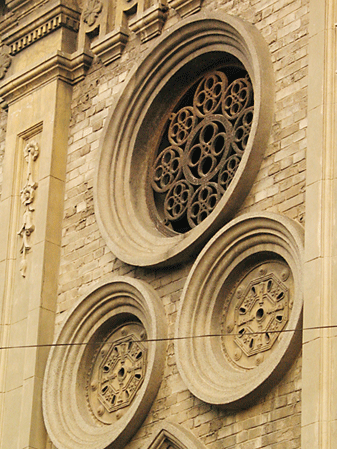③窗戶“合十”、“天圓地方”:古德寺窗戶的設(shè)計可謂別具一格。寶殿墻上可見三個一組的圓窗,分別為哥特風(fēng)格和中國的八卦圖;圓窗下是形如竹筍的花窗,象征著佛祖雙手合十的姿態(tài);回廊里的窗戶則上圓下方,取“天圓地方”之意。