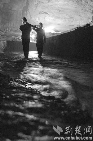 寂寞的蝙蝠第一次接待了人間來(lái)客,沉睡萬(wàn)年的巖溶洞穴第一次迎來(lái)了觀者。但黑暗陌生的世界還是讓堂堂男兒們感覺(jué)了一絲陰森恐怖。他們?cè)?tīng)當(dāng)?shù)匕傩諅髡f(shuō),洞里有巨蟒,所以至今沒(méi)人敢進(jìn)洞!白ゾo時(shí)間測(cè)量!”來(lái)不及恐懼,他們?yōu)樽约汗膭牛驗(yàn)檫@里隨時(shí)可能發(fā)生漲水、墜落等危險(xiǎn)?上,第一次經(jīng)驗(yàn)不足,手電筒的電池很快用完了,一行人只得互相攙扶著,摸索出溶洞。“后來(lái),我們又進(jìn)去了7次,終于測(cè)出了暗河的具體位置和流向!狈轿奈湔f(shuō)。