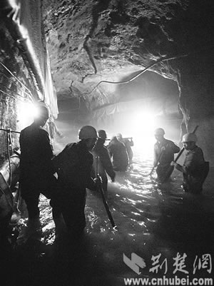 這是一群怎樣的鋼鐵漢子喲!他們兩年中遭遇38次突泥突水,每次大的搶險,都要持續(xù)數(shù)十小時,每次都有10多人暈倒;從開工至今,先后有20多名工人實(shí)在頂不住,走掉了,但絕大多數(shù)人沒有向困難低頭,選擇了繼續(xù)戰(zhàn)斗;在掘進(jìn)工作面上,除了機(jī)械設(shè)備,他們身邊還有50多套救生衣、救生圈,1萬多條防水編織袋,甚至還有一只皮劃艇……