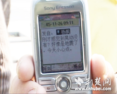 用戶:ymcbz 今天上午8時(shí)45分左右,我們還以為起了大風(fēng)……有的人已經(jīng)跑到樓下:是不是有地震? 五樓的小涂說:太陽能水管在擺動(dòng)……前樓的小王說:窗簾斜擺,風(fēng)鈴發(fā)聲! 家里魚缸的水晃出來了! 縣檢察院正在開會(huì),桌上的茶杯晃動(dòng),大家都往樓下跑。 感謝荊楚網(wǎng),快速告訴了我們事實(shí)的真相!
