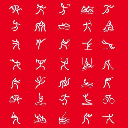 北京奧運會體育圖標(biāo)設(shè)計包括35個圖標(biāo),分別是田徑、賽艇、羽毛球、棒球、籃球、拳擊、皮筏艇(靜水)、皮筏艇(激流)、自行車、馬術(shù)、擊劍、足球、體操、藝術(shù)體操、蹦床、舉重、手球、曲棍球、柔道、摔跤、游泳、花樣游泳、跳水、水球、現(xiàn)代五項、壘球、跆拳道、網(wǎng)球、乒乓球、射擊、射箭、鐵人三項、帆船、排球和沙灘排球。