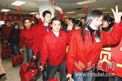 昨晚8時(shí)30分,統(tǒng)一著深紅服裝,拖著相同的紅色拉桿皮箱,89名湖北籍在浙江的農(nóng)民工微笑著走出武漢天河機(jī)場。