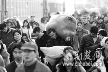 連日來(lái),武昌火車站,滾滾旅客流中,背著大包小包的返鄉(xiāng)農(nóng)民工明顯增多了(上圖)。一年辛勞,收獲頗豐,農(nóng)民工露出了開(kāi)心的笑容(下圖)。記者采訪得知,他們提前返鄉(xiāng),一方面是想避開(kāi)春運(yùn)高峰,同時(shí)也想多一些和家人團(tuán)聚的時(shí)間。(記者張磊田悅攝)