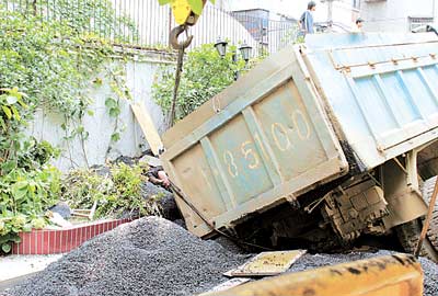 荊楚網(wǎng)(楚天都市報(bào)) (記者 劉俊華 實(shí)習(xí)生 蘆何秋 記者 宋枕濤) 昨日下午2時(shí)許,漢口球場新村一校園刷黑施工現(xiàn)場,一輛滿載瀝青的貨車軋塌路基發(fā)生側(cè)歪,車廂內(nèi)瀝青傾瀉而下,埋住了一位指揮倒車的農(nóng)民工。幾分鐘后,這位工人被工友們扒出來,因?yàn)r青溫度太高,他只揮動了兩下手,就再也沒能醒來……