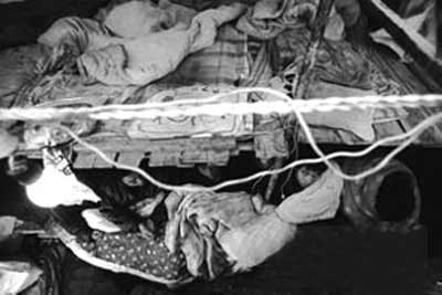 “我們睡覺(jué)的地方比馬路上還冷”,石棉瓦搭蓋的簡(jiǎn)易屋里四面透風(fēng),兩塊塑料布做的屋頂被風(fēng)刮得只剩一半。當(dāng)日上午10時(shí)許,記者看到,屋內(nèi)是木板搭建的上下兩層大通鋪,寒風(fēng)中,農(nóng)民工們裹著被子哭泣。