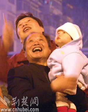 漢陽的劉春華一大家子人特別引人注目,因?yàn)樗麄優(yōu)榇蠡镎故玖艘粓鲂⌒偷乃饺搜婊鹜頃。她的四兄弟姊妹,從面包車上扛下大包大包箱子般大小的焰火,依次在江邊擺開。不一會,幾道彩色的光柱就在天空閃耀,彩色幕布被拉開。震耳的轟響,讓孩子們又愛又怕,躲在父母的身后偷偷地捂著耳朵跳鬧。70多歲的爺爺奶奶微笑著,安靜地看著自己十多個子子孫孫們歡暢的一幕。