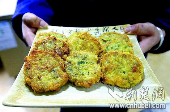 湖北日報訊 早春,野菜餅成為咸寧市百姓一道特色佳肴。制作野菜餅時,先取新鮮魚肉打成魚蓉,再將采摘的新鮮野芹菜、野韭菜等切成沫,加入魚蓉混合攪勻,制成直徑十厘米大小的小餅上蒸鍋蒸,再裹上蛋黃煎至金黃,清香撲鼻。