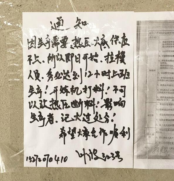 執(zhí)法人員查處時(shí),工人們并不驚慌,部分工人甚至繼續(xù)趕工。墻上張貼的通知寫著:“因生產(chǎn)需要……拉模人員務(wù)必達(dá)到12小時(shí)上班生產(chǎn)。”廠方一負(fù)責(zé)人辯稱:這里不是在造假,而是讓工人練手藝。