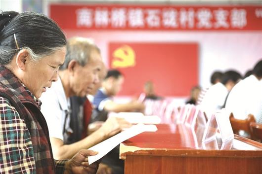 通山縣南林橋鎮(zhèn)石垅村黨支部開展支部主題黨日活動(dòng),黨員共同誦讀黨章。