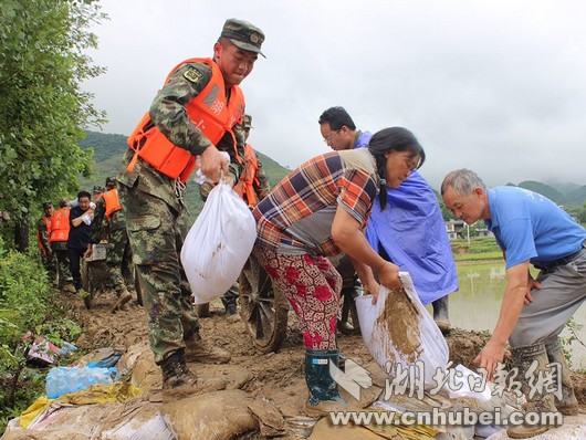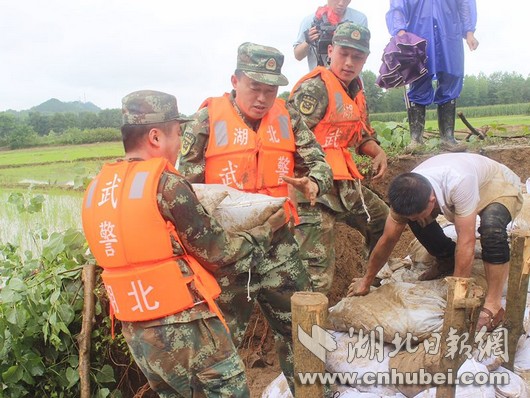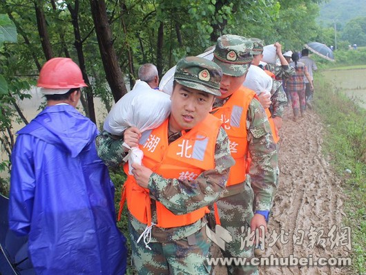 災(zāi)情就是命令,武警湖北總隊(duì)咸寧支隊(duì)立即啟動應(yīng)急機(jī)制,按預(yù)案迅速出動官兵20余名,攜帶救生繩、救生圈、編織袋、鐵鍬、洋鎬等工具第一時間奔赴現(xiàn)場,擔(dān)負(fù)裝填沙袋和筑堤任務(wù)。
