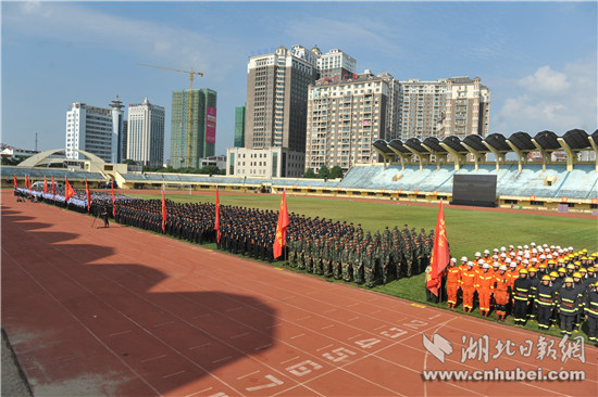 在警務技能演練之后,武警支隊、特警支隊和赤壁市公安局等單位60名民警,進行了反暴恐合成作戰(zhàn)演練:公交車上制服歹徒、排爆員移除可疑爆炸物、狙擊手制服恐怖分子、談判專家現(xiàn)場喊話確保人質安全……短短10多分鐘,各警種精誠合作,成功處置一起暴恐事件。隨后,民警和消防官兵又先后進行了重大交通火災事故救援處置、突發(fā)事件應急處置綜合演練。