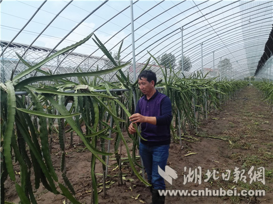 見到新農(nóng)蔬菜合作社負責人張?zhí)姇r,他正在大棚里查看火龍果長勢?!斑@是把臺灣大紅和海南蜜寶進行嫁接培育的新品種,口感特別好,今年訂單已排滿了?!?/p>