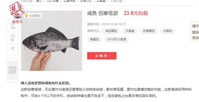 據(jù)了解,“咸魚(yú)”筆袋的主人是個(gè)初一孩子,記者聯(lián)系他的媽媽后得知,筆袋是孩子在網(wǎng)上挑選后,她購(gòu)買(mǎi)的?!安恢浪麨槭裁聪矚g這個(gè)筆袋?!笔潞?,記者在淘寶、京東上搜索“咸魚(yú)筆袋”后,也確實(shí)發(fā)現(xiàn)了類(lèi)似的筆袋。