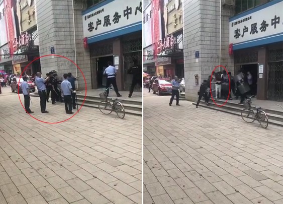 據(jù)現(xiàn)場視頻顯示,多名警務(wù)人員持警械將自來水公司客戶服務(wù)中心圍住,現(xiàn)場叫喊聲嘈雜。雙方在對(duì)峙后,一名警察連續(xù)向店內(nèi)射擊3次,隨后其余警務(wù)人員持鋼叉及盾牌上前,經(jīng)短暫搏斗后,將一名男子帶出。嫌疑人被帶出時(shí),依舊能夠站立走動(dòng)。