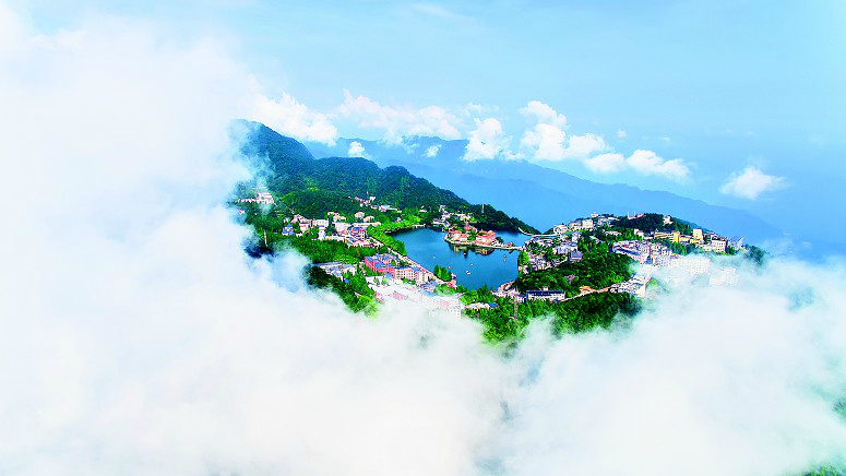 8月4日,空中鳥(niǎo)瞰通山縣九宮山國(guó)家級(jí)風(fēng)景名勝區(qū),山頂?shù)脑浦泻ㄈ灰恍隆?/p>