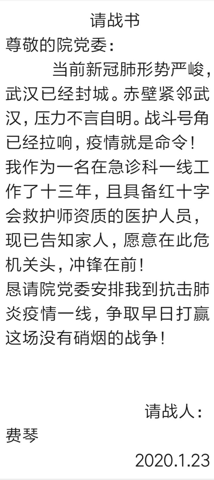 “我作為一名在急診科一線工作了十三年,且具備紅十字會救護師資質(zhì)的醫(yī)護人員,現(xiàn)已告知家人,愿意在此危機關(guān)頭,沖鋒在前?!边@是來自市人民醫(yī)院急診科醫(yī)護人員費琴的請戰(zhàn)書內(nèi)容,讓人淚目。