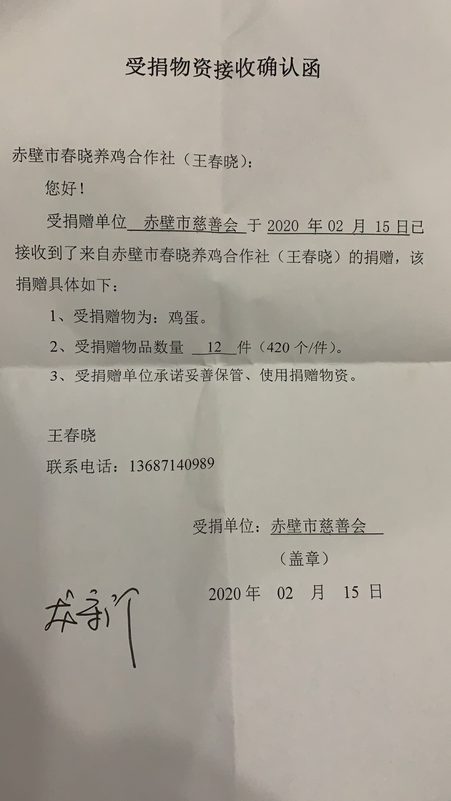 據(jù)悉,赤壁市意豐農(nóng)業(yè)合作社捐贈大米3噸,赤壁市春曉養(yǎng)雞合作社捐贈雞蛋5040枚,赤壁市浚龍養(yǎng)雞場捐贈雞蛋7200枚。