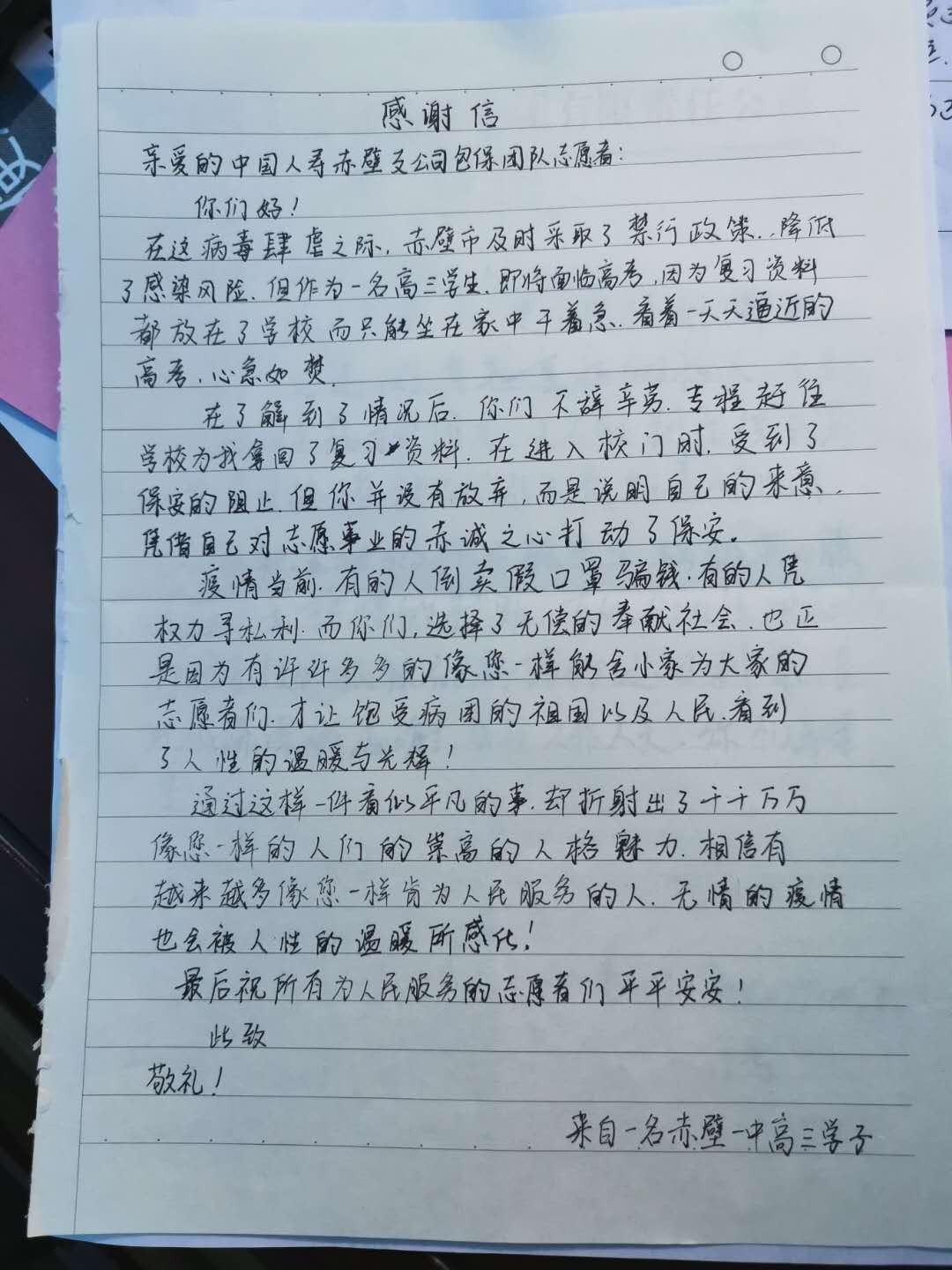 “作為一名即將面臨高考的高三學(xué)生,因?yàn)閺?fù)習(xí)資料都放在了學(xué)校而只能坐在家中干著急??粗惶焯毂平母呖?,心急如焚!謝謝你們不辭辛勞,專程趕往學(xué)校為我拿回了復(fù)習(xí)資料……”這是一名高三學(xué)生寫給小區(qū)包保單位中國人壽赤壁支公司的一封感謝信。這樣的感謝信該公司還收到很多,有感謝聯(lián)系車輛為患者買藥的,有感謝為他們購買奶粉等生活物資的……