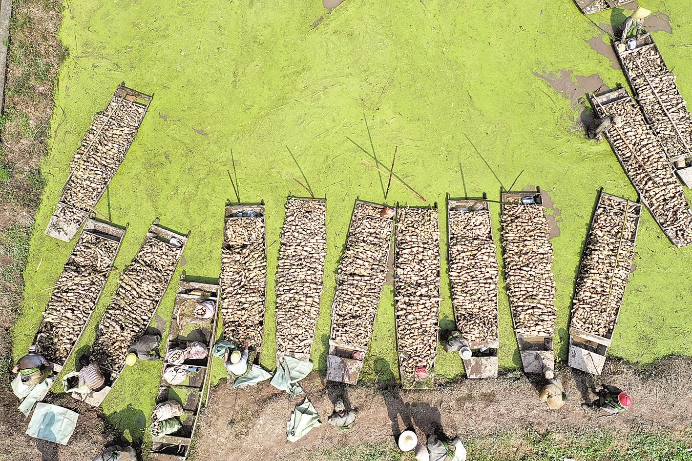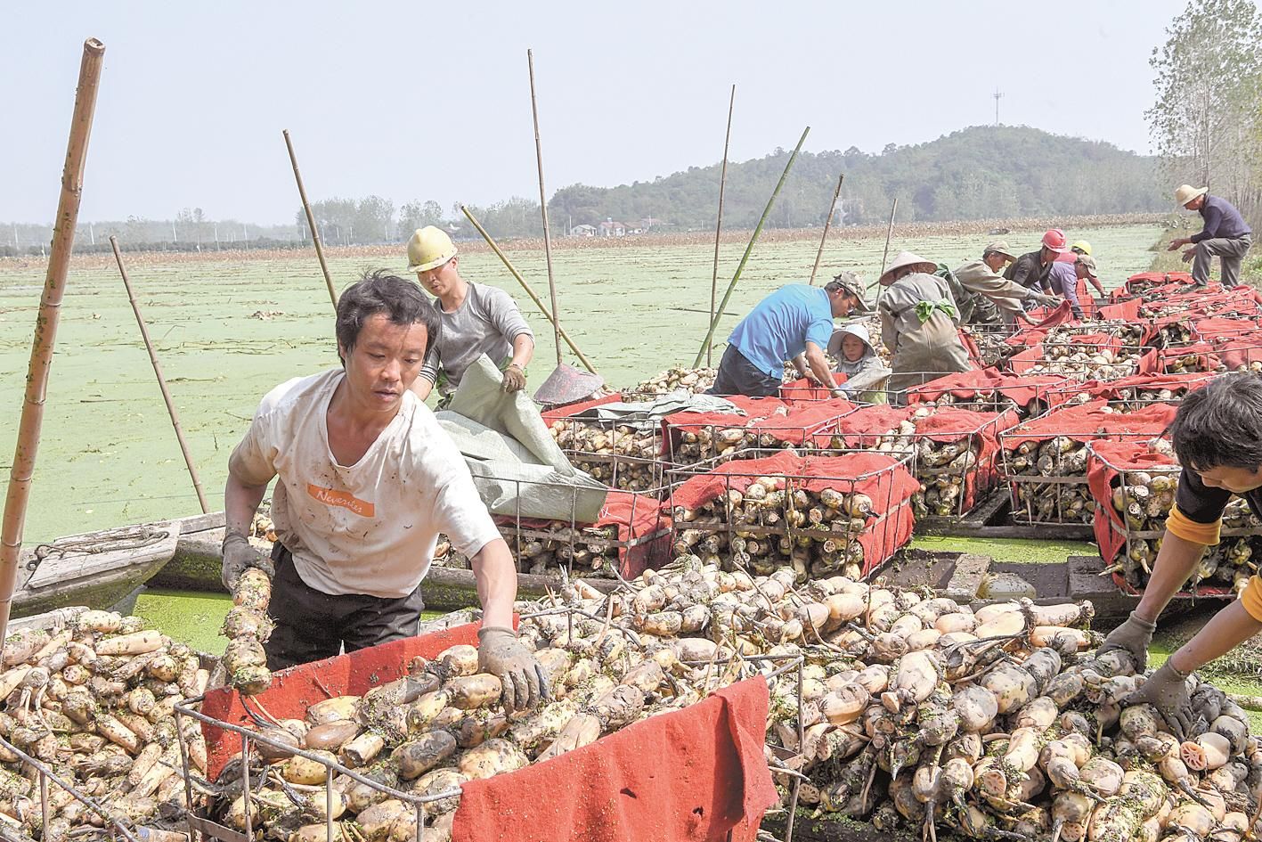10月13日,嘉魚縣陸溪鎮(zhèn)農(nóng)民趁著晴好天氣挖藕。這些蓮藕經(jīng)嘉魚鴻富農(nóng)產(chǎn)品有限公司加工后,將出口至東南亞和北美等地區(qū)。嘉魚縣蓮藕、蓮子、藕帶是區(qū)域特色明顯的優(yōu)勢(shì)農(nóng)產(chǎn)品。近年來,嘉魚縣把發(fā)展蓮藕作為調(diào)整農(nóng)業(yè)產(chǎn)業(yè)結(jié)構(gòu)、增加農(nóng)民收入的重要途徑。目前,全縣蓮藕種植面積4.85萬畝,2019年全縣蓮藕產(chǎn)業(yè)實(shí)現(xiàn)綜合產(chǎn)值5.6億元。