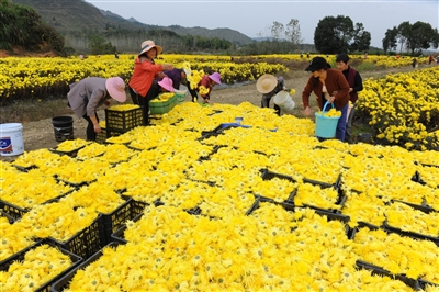 11月4日,通山縣燕廈鄉(xiāng)湖畔村皇菊種植基地,金絲皇菊怒放,猶如一張金色地毯舒展在田野上,村民穿梭在花叢中采收菊花。燕廈鄉(xiāng)湖畔村是典型的庫(kù)區(qū)貧困村,近年來(lái),市公共檢驗(yàn)檢測(cè)中心駐村工作隊(duì)和燕廈鄉(xiāng)黨委政府結(jié)合湖畔村地理環(huán)境,成立村集體合作社,打造60畝金絲皇菊種植基地,延伸菊花深加工產(chǎn)業(yè)鏈,通過(guò)與貧困戶采取“勞務(wù)聯(lián)結(jié)機(jī)制”簽署合同協(xié)議,讓村民實(shí)現(xiàn)家門口就業(yè)。