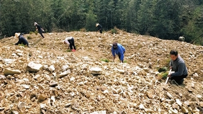 2月17日(大年初六)上午,春風(fēng)輕拂,暖陽高照,年味正濃,在青山疊翠的汀泗橋鎮(zhèn)古田村十四組背底窩的一個小山坡上,傳來一片歡笑聲和鋤地聲,40余名村民正在忙著栽種杉樹苗。