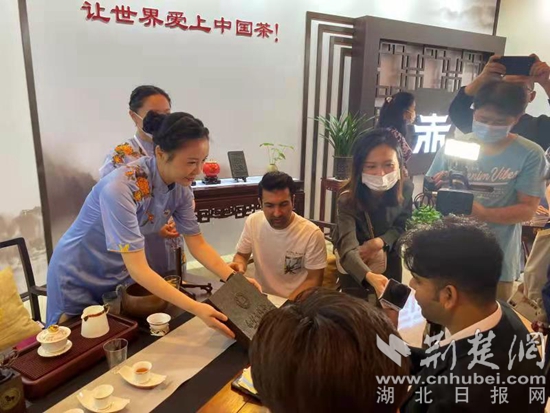 在高質(zhì)量互聯(lián)互通分論壇赤壁青磚茶展位,擠滿了前來(lái)品嘗赤壁青磚茶和茶點(diǎn)美食的嘉賓,茶藝師忙個(gè)不停,續(xù)杯、補(bǔ)充茶點(diǎn),向嘉賓介紹赤壁青磚茶的歷史和特點(diǎn),講解各類茶葉知識(shí)。