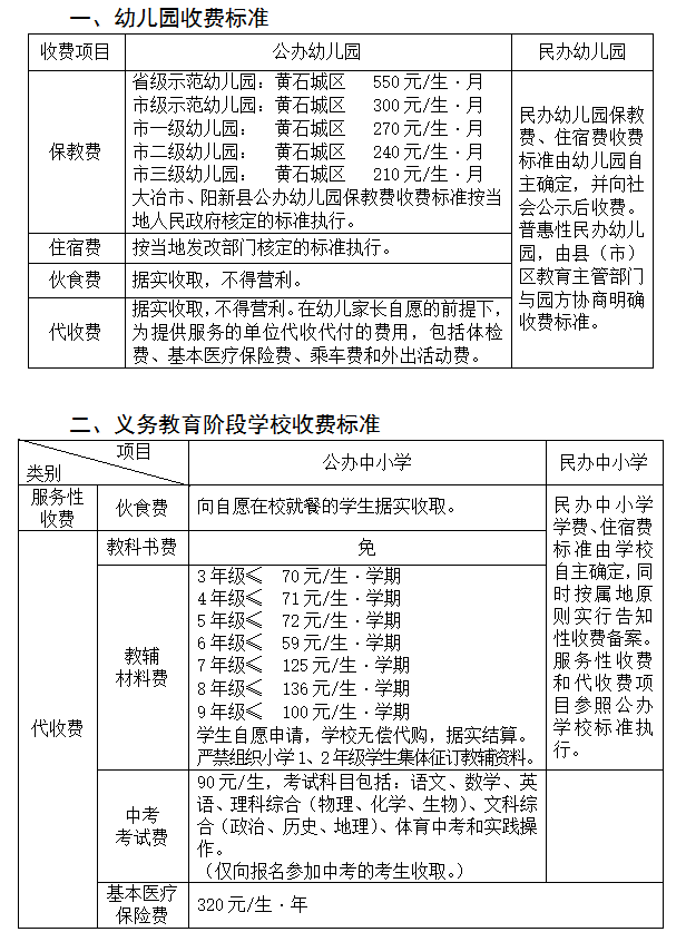 黃石市2021年秋季中小學(xué)(幼兒園)收費(fèi)標(biāo)準(zhǔn)。來源:黃石市教育局官網(wǎng)