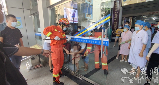 四歲女孩左手臂被醫(yī)院玻璃門卡住,消防開(kāi)展救援。通訊員供圖