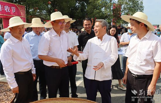 燕兒谷景區(qū)負(fù)責(zé)人徐志新(右二)向羅田縣委副書記、代縣長周黎(左三)介紹特色農(nóng)產(chǎn)品豐收情況。通訊員 張曉雨 攝