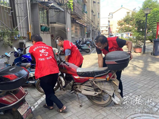 圖為審計(jì)人員協(xié)力將違規(guī)停放摩托車搬至停放區(qū)內(nèi)。通訊員 供圖