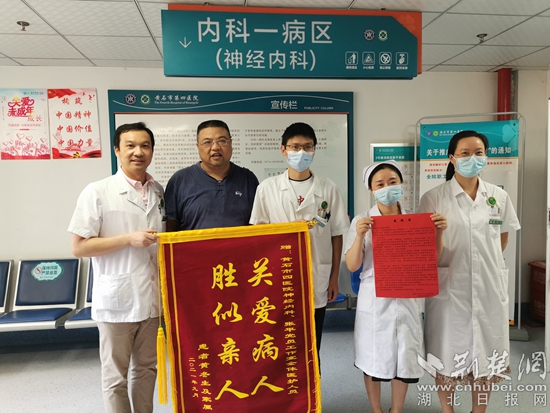 荊楚網(wǎng)(湖北日?qǐng)?bào)網(wǎng))訊(通訊員付方)9月28日下午,黃石市第四醫(yī)院神經(jīng)內(nèi)科正在全力搶救一名新收的重癥患者。走廊盡頭,一名男子手捧錦旗靜靜等候,只為了把錦旗親自送到科主任張平手中。