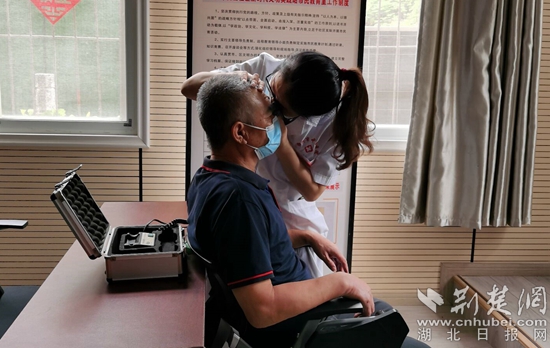 隨后,醫(yī)務(wù)人員給大家免費(fèi)測(cè)量血壓、血糖、疫情常態(tài)化防控方面知識(shí)、慢病健康知識(shí)咨詢等。余臘梅還為社區(qū)的居民們提供免費(fèi)視力普查及驗(yàn)光、眼底檢查等。