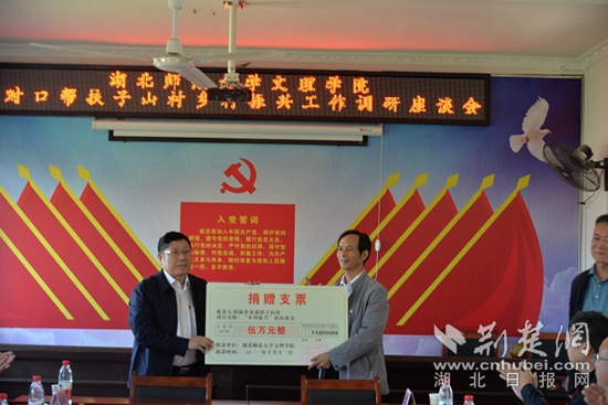 湖北師范大學(xué)文理學(xué)院常務(wù)副院長楊學(xué)斌代表學(xué)院向木港鎮(zhèn)子山村捐贈5萬元鄉(xiāng)村振興建設(shè)資金。