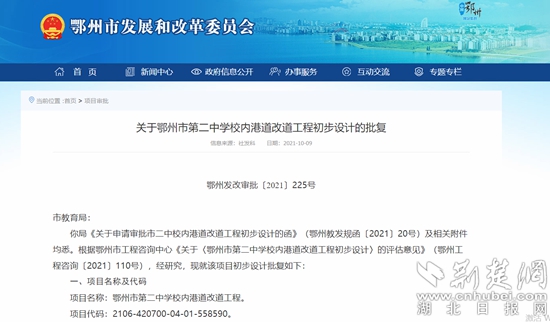 荊楚網(wǎng)(湖北日?qǐng)?bào)網(wǎng))訊(記者 阮瓊)日前,鄂州市發(fā)改委對(duì)鄂州市第二中學(xué)校內(nèi)港道改道工程初步設(shè)計(jì)進(jìn)行批復(fù)。該項(xiàng)目建設(shè)工期為6個(gè)月,概算投資1474.35萬(wàn)元。