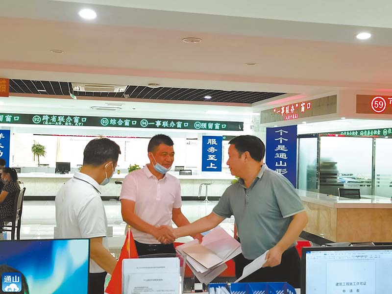“1個地塊5個證,一共25個證,沒想到一天就能拿到手!”9月30日下午,在通山縣政務(wù)服務(wù)中心工程建設(shè)項目綜合審批窗口,通山縣興達(dá)鞋業(yè)有限公司經(jīng)理程宏兵從縣住建局局長手中接過厚厚的一摞證,意味著通山縣興達(dá)鞋業(yè)有限公司在通山的地塊達(dá)到開工條件。