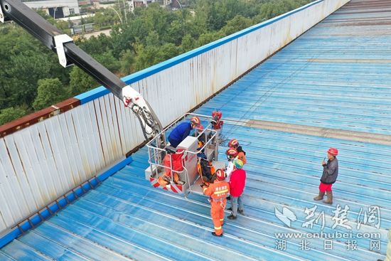 羅橋消防救援站站長(zhǎng)立刻做出判斷,將救援人員分為三組,一組救援人員利用無(wú)人機(jī)進(jìn)行空中勘察,實(shí)時(shí)匯報(bào)現(xiàn)場(chǎng)情況。二組救援人員攜帶簡(jiǎn)易輕便救援工具前往屋頂,檢查現(xiàn)場(chǎng)屋頂情況,避免被困人員因屋頂?shù)顾盏蕉蝹?。同時(shí),三組駕駛員立即升起68米登高平臺(tái)車,由羅橋消防救援站站長(zhǎng)帶領(lǐng)一名醫(yī)護(hù)人員,從空中救援。經(jīng)過40余分鐘的緊急救援,被困工人被成功救出,隨后交給醫(yī)護(hù)人員送往醫(yī)院。