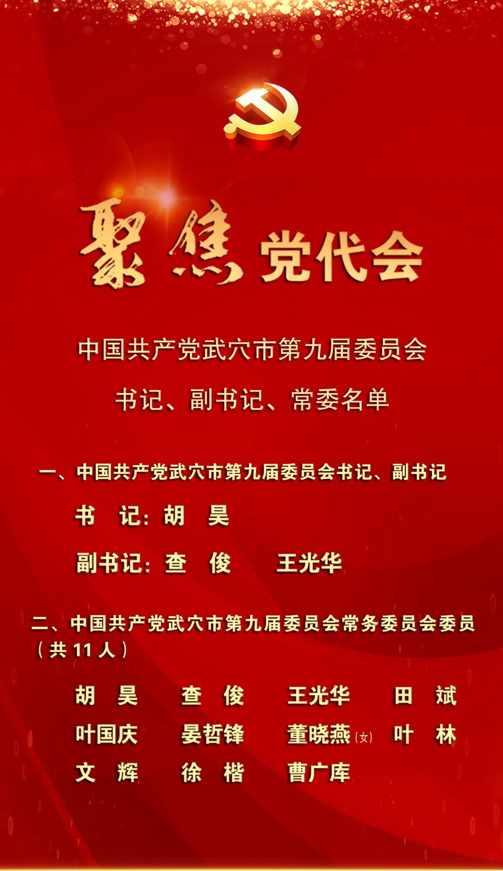 10月30日,中國共產(chǎn)黨武穴市第九屆委員會舉行第一次全體會議。會議選舉產(chǎn)生了中國共產(chǎn)黨武穴市第九屆委員會書記、副書記、常務(wù)委員。