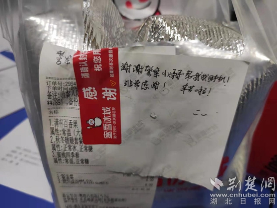 拿到失而復(fù)得的手機(jī),小婕長舒了一口氣,感激地握著朱振武的手連連道謝。11月2日,小婕點(diǎn)了奶茶外賣表示感謝,擔(dān)心民輔警們拒收,特意留下“暖心”字條希望民輔警們收下,便出現(xiàn)了開頭的一幕。