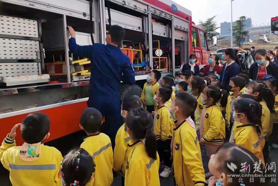 “小朋友,這每輛消防救援車在救援中都有不同的用途,這是搶險救援車,這里有出水口,水帶是接這里的……”小朋友們在老師的帶領(lǐng)下有序參觀消防救援車,消防人員耐心詳細地向師生們一一介紹每輛消防救援車名稱、性能、用途、使用方法,并耐心地回答小朋友提出的各種問題,現(xiàn)場氣氛十分活躍。