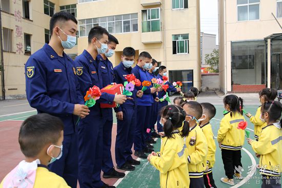 小朋友們給消防叔叔送上了親手制作的祝福卡和小花。通訊員 供圖