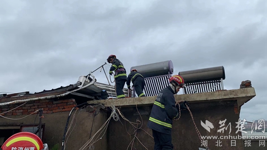 7日13時(shí)18分,有群眾報(bào)警稱鄂城區(qū)花園小區(qū)樓頂有太陽(yáng)能墜落危險(xiǎn),情況緊急,急需救援。消防員到場(chǎng)后,根據(jù)現(xiàn)場(chǎng)情況立即下達(dá)指令:一組對(duì)現(xiàn)場(chǎng)進(jìn)行警戒,預(yù)防墜物傷人;另一組使用繩索、斷電鉗和掛鉤等救援器材將懸掛在屋檐外的太陽(yáng)能轉(zhuǎn)移到安全位置,并對(duì)太陽(yáng)能進(jìn)行捆綁固定。