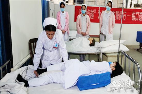 她采用真人實(shí)操進(jìn)行現(xiàn)場良姿位的擺放,例如:患者一側(cè)肢體偏癱如何協(xié)助左右翻身、單人搬運(yùn)到輪椅,使頭身足處于功能體位、避免肢體受壓、預(yù)防墜床及跌倒等??浦R(shí)。