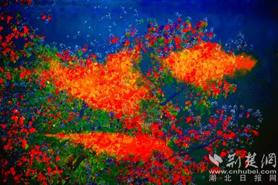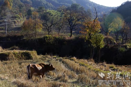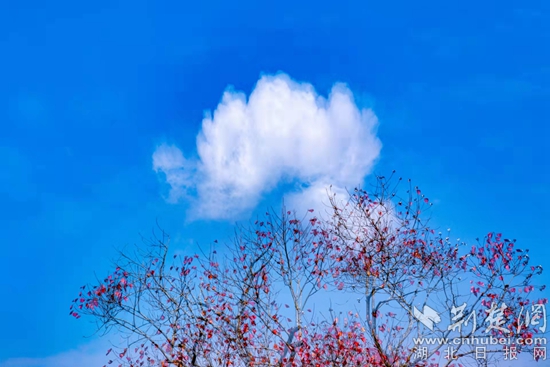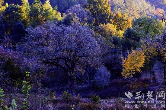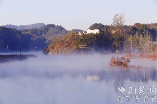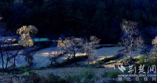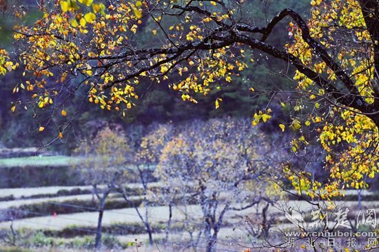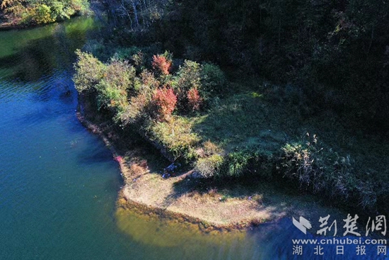 位于羅田縣東部、大別山南麓的白廟河鎮(zhèn)林家坳村的初冬,美得“一塌糊涂”。描繪美景的顏料是烏桕、紅楓、銀杏、馬尾松等樹木的葉子和柿子樹的果子。它們有紅的、綠的、黃的、橙的、紫的、白的,還有那田畈里泛黃的稻樁,流光溢彩,自然天成。暖陽下,梨花湖邊的烏桕樹和松樹倒映在水中,那紅的葉子、綠的松針,偶爾飛過的野鳥,被潔凈的湖水染成一幅絕美的畫卷。