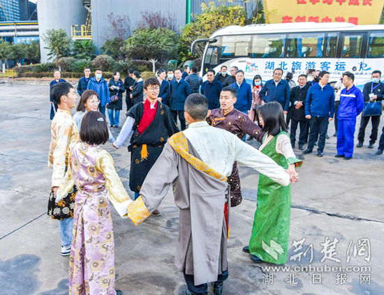 在廠區(qū)內,黃石新興招聘的7名藏族學生以熱烈的藏族舞蹈歡迎了全國17個對口援藏省市組成的觀摩團隊的到來,并為他們獻上哈達。在公司工作人員的講解下,觀摩團詳細了解了藏族學生們在黃石新興管業(yè)工作及生活的動態(tài)。